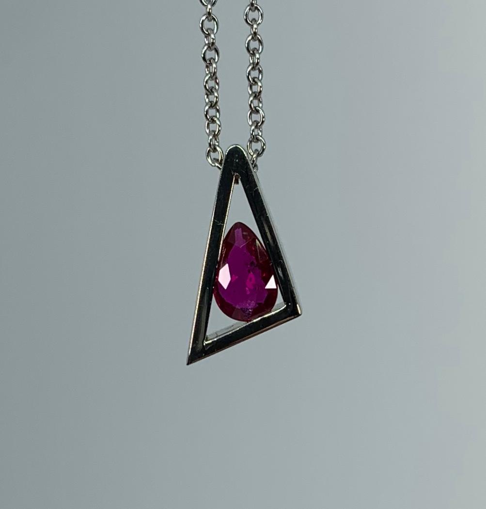 Elevate your style with this captivating pendant, showcasing a striking 14k white gold obtuse triangle frame that highlights a deep red pear-shaped ruby. This asymmetrical design offers a sophisticated look, making it a standout piece in any jewelry collection.