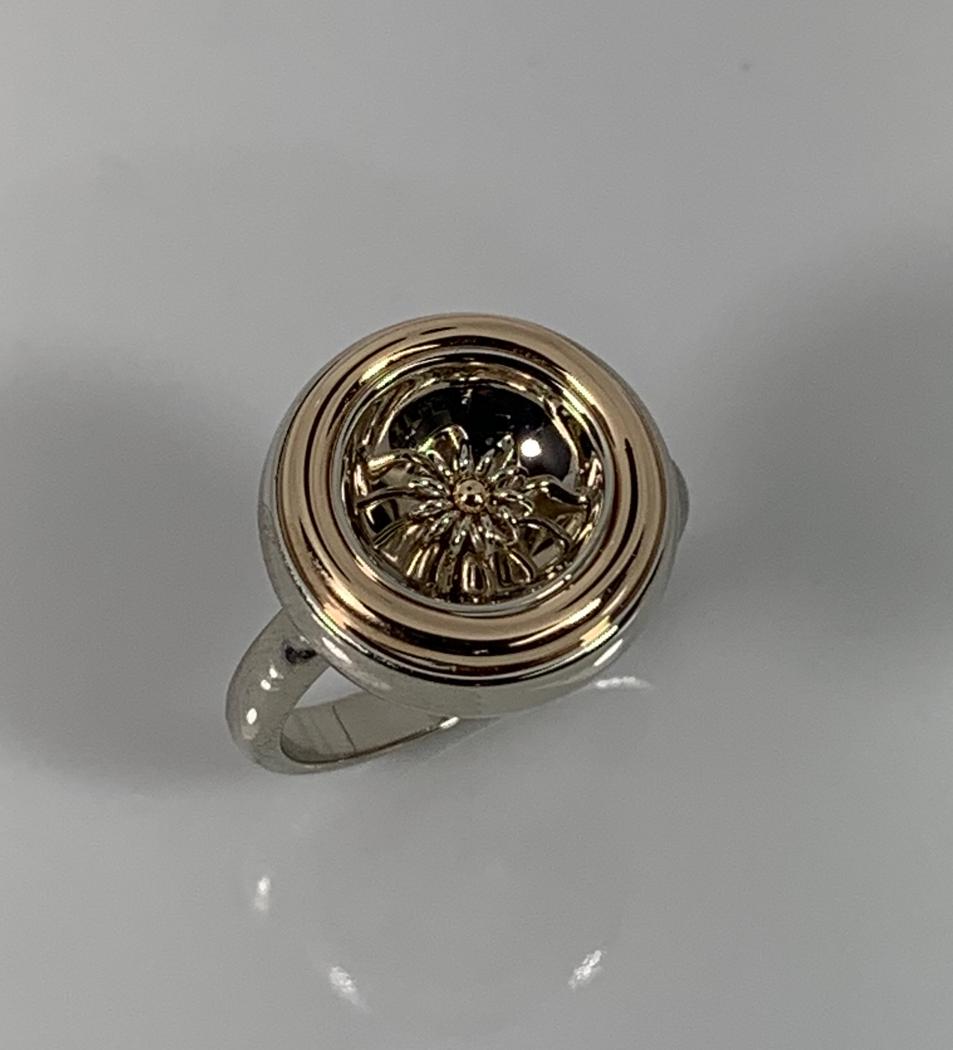This is a 14k white and yellow gold ring features a unique bowl that has a yellow gold ball in the center and white gold pedal that reflect and catch the sparkle from every direction. At the top of the bowl is a gold round trim to accent. The top of the ring is 15.89mm with a 3mm shank.