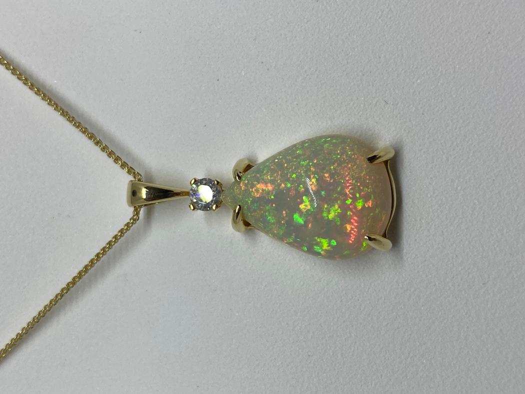This pear shaped opal pendant has a 5.20ct opal and a 0.18ct diamond set in 4 prong setting and 14k yellow gold. The pendant measures 12.37mm wide and 27.58mm tall with the bail. This bail will fit most standard chains.