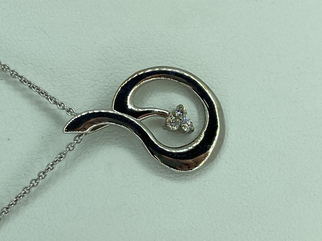 This 14k white gold freeform pendant has three bright white, eye clean diamonds in the center that have a total weight of 0.12cttw. The overall length of this pendant is 26.55mm and is 17.55mm wide. There is a hidden bail on the back that will accomidate most standard size chains.