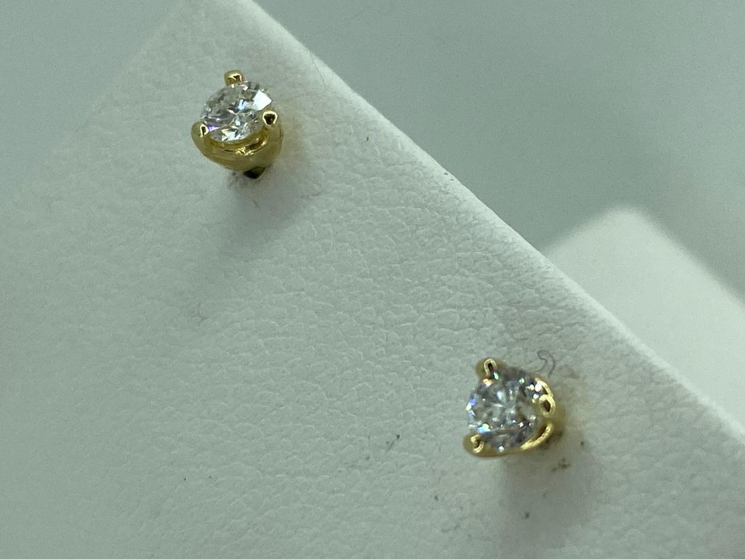 Martini set diamond stud earrings in 14k yellow gold with friction backs. The diamonds are a total weight of 0.27cttw. Martini setting has a cone-like shape, so the bottom of the setting gradually becomes narrower. The profile of this setting resembles a martini glass. Diamonds are set lower and closer to the ear allowing the diamond to appear to float.