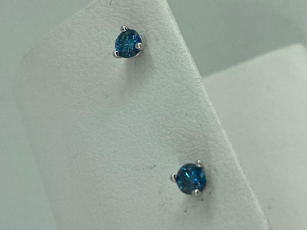 Martini set irrid blue diamond stud earrings in 14k white gold with friction backs. The diamond total weight is 0.64cttw. Martini setting has a cone-like shape, so the bottom of the setting gradually becomes narrower. The profile of this setting resembles a martini glass. Diamonds are set lower and closer to the ear allowing the diamond to appear to float.