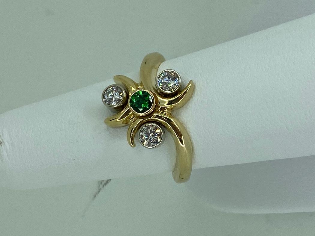 This 14k yellow gold base ring has a 0.11ct AA bezel set tsavorite garnet in the center with three G/H-SI bezel set in 14k white gold diamonds that have a total weight of 0.51ctte. Each of the diamonds are sitting inside a cresent, two of which are created by the shank twisting around it. This ring is a size 6.5