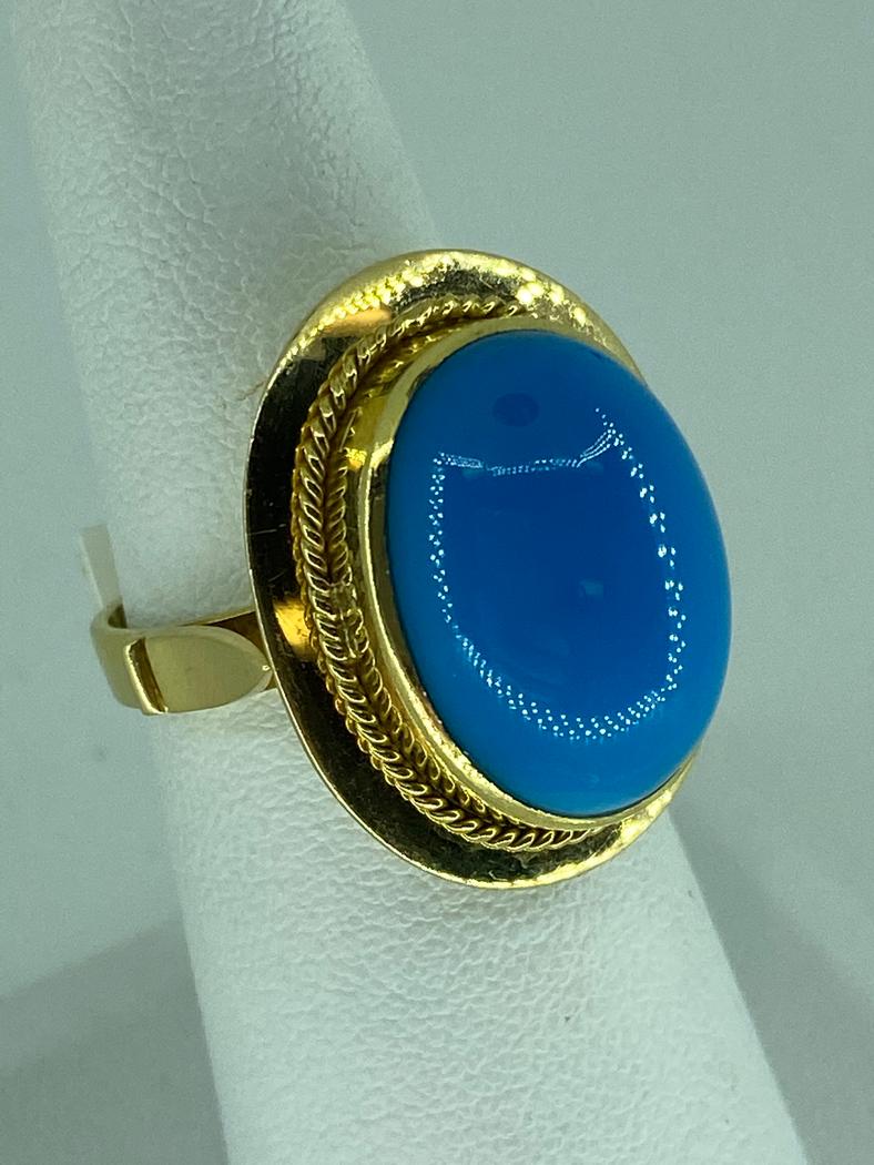 This 18k yellow gold ring has a stunning blue Persian turquoise that is 30+cttw. and bezel set with a twisted wire at the base of the bezel. The bezel set turquoise measures 13.9mm by 18.25mm. The base of the top of the ring measures 18.55mm by 23.35mm. The shank is 3.1mm and this ring is a size 6.75.