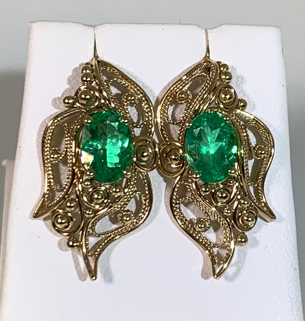 These stunning earrings showcase 2.23cttw of vivid oval emeralds, each four-prong set at the heart of delicate, handcrafted filigree. Measuring 26.45mm in length and 13.64mm wide, they sway gracefully from classic French wires—an enchanting blend of vintage charm and timeless romance.