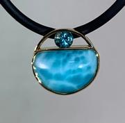 This 14.39ct larimar is encased y a hand fabricated bezel in 14k yellow gold and accented by a tension set 0.83ct blue zircon. A bail is hidden in the top by mimmcking the curve of the bezel. The opening in the bail is large enough to accommodate most standard size chains. On the back of the larimar is an extra hidden treasure of hand twisted filigree in 14k yellow gold. This pendant is 18.3mm in length and 18.95mm wide.