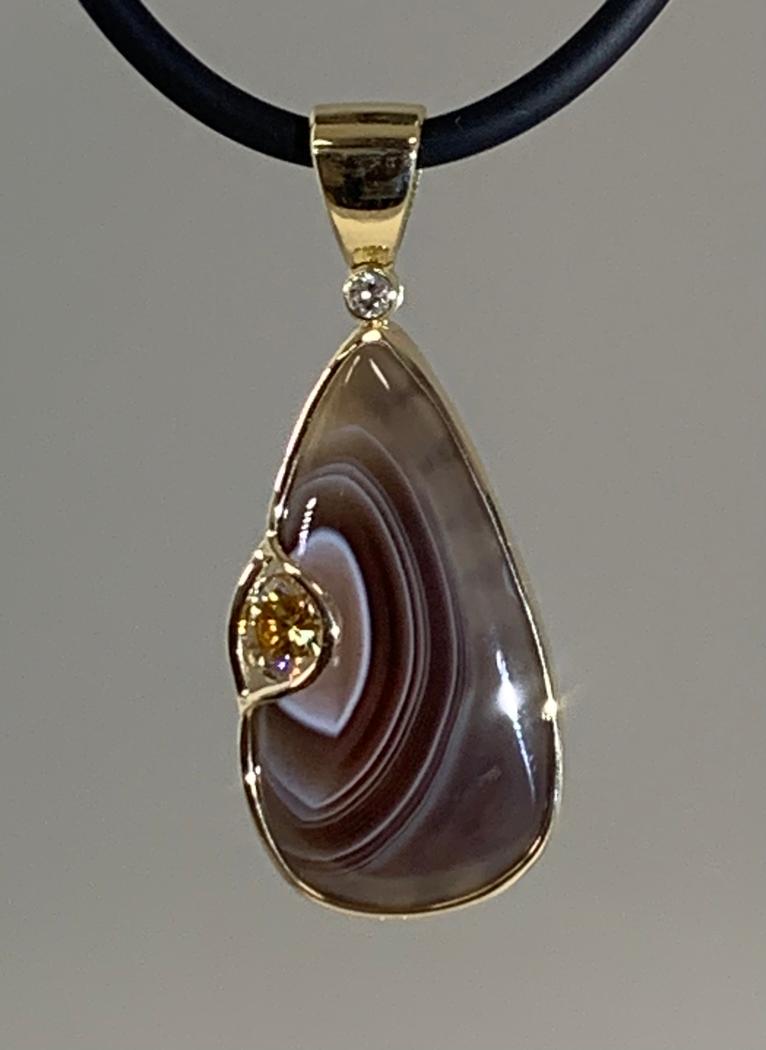This 19.9ct Botswana agate has a hand fabricated bezel around it with a 0.68ct brown moissanite tension set into the side of the Botswana agate complimenting the natural pattern of the stone. The top has a 0.04ct bezel set diamond that has a hidden bail behind it that will accommodate most standard size chains. The overall length of this pendant is 43.89mm and it is 11.33mm at the widest part. The detail of the back of this pendant is detailed with beautiful filagree work.