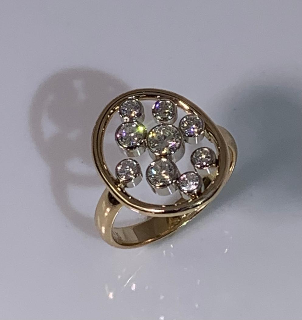 This 14k yellow and white gold fashion ring is a refined expression of elegance, featuring 1.38ct total diamond weight. The bezel-set diamonds, with SI clarity and G-H color, sit close to the hand, making it the perfect choice for daily wear. With its graceful design, the ring measures 19.95mm at the top, approximately 16.40mm on the sides, and 3.50mm at the base of the shank. Currently a size 7, it can be resized for a perfect fit—timeless, sophisticated, and effortlessly chic.