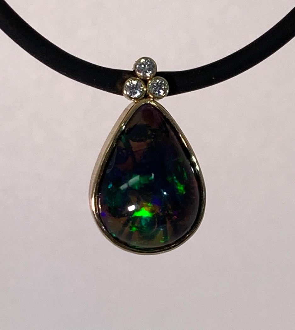 This stylish 14kt yellow gold pendant that is bezel set with a 7.91ct.Black Opal that is, blue broad flash patterned lightning ridge solid black opal. This beautiful handcrafted pendant also features three sparkling white diamonds in a bezel setting 0.18cttw below the black opal gemstone. The measurements for this stunning pendant is 24mm height by 14mm width.