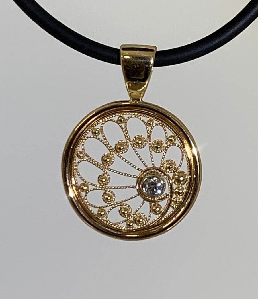 This artistic open based 14k yellow gold diamond pendant has a bezel set There is hand twisted filigree, 0.16cttw and bezel set diamond that are bright white, eye clean set into the filigree. This pendant measures 23.95mm at the highest and the width is 23.95mm