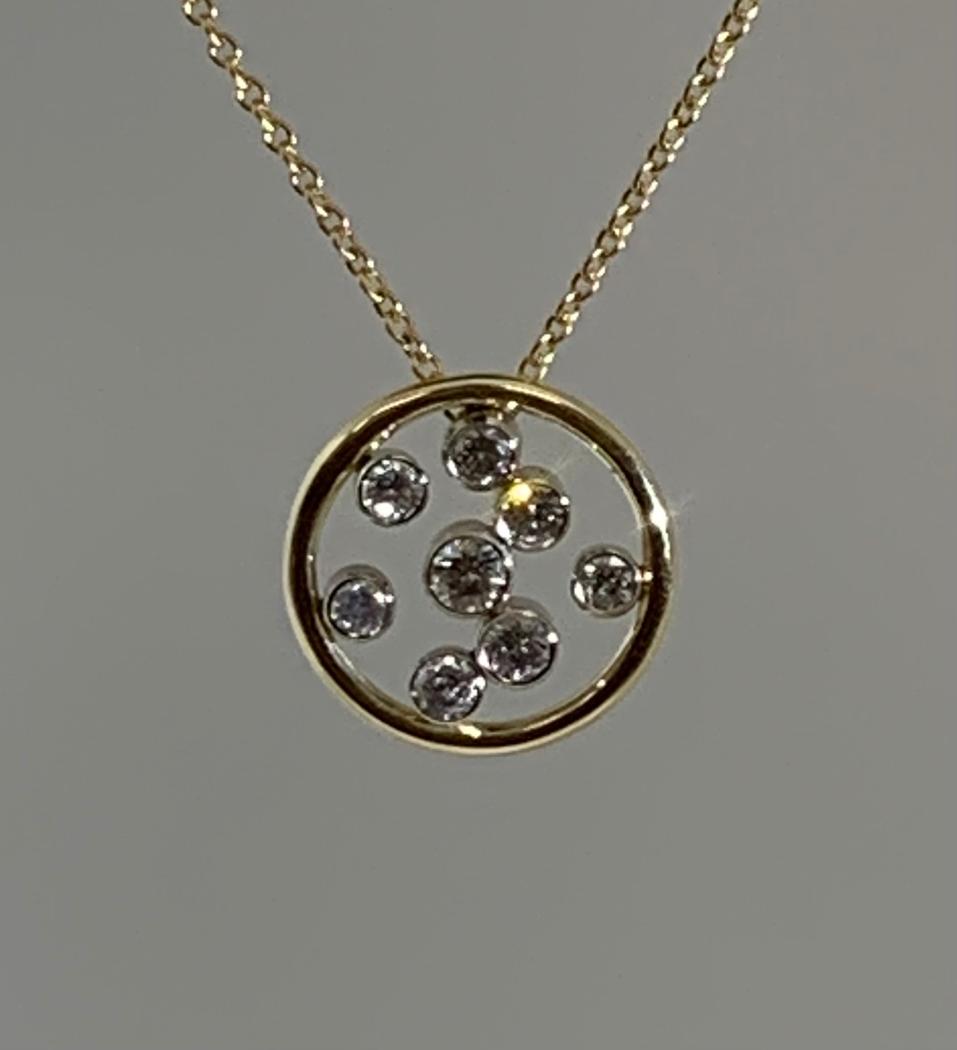 This exquisite 14kt yellow gold diamond bubble pendant, featuring a hidden bail that accommodates various chain sizes, makes for a timeless gift of love. With 1.10 carats of total diamond weight and eight bezel-set diamonds, this pendant symbolizes enduring beauty and commitment. Measuring 23mm in length, it is a perfect representation of a bond that lasts forever. Ideal for anniversaries, engagements, or any special occasion, it can be paired with an 18-inch chain (available for an additional fee) to create a truly meaningful and romantic gesture.