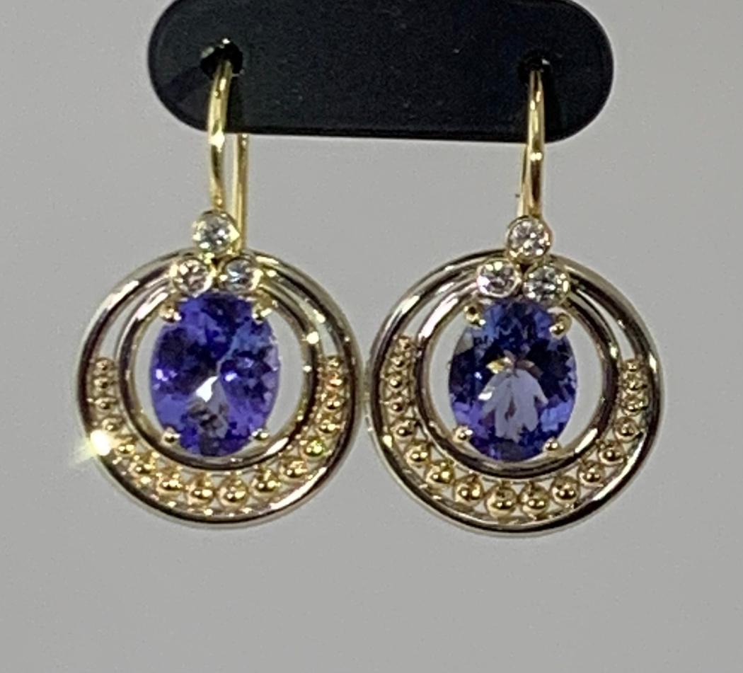 These natural oval tanzanite and diamond earrings, that have been made by Alex Maryaskin with the milgrain design that are two tone in gold and can be worn daily.