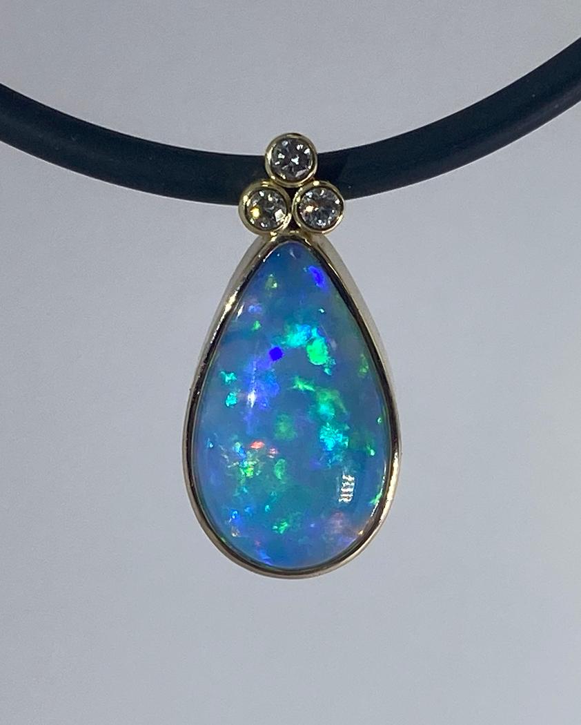 This hand made one-of-a-kind pendant features a 7.78ct stunning opal. The hand created bezel on the opal has a open basket effect on the sides while the back is all hand created by individual 14k gold tiles to give it dimension. The top of the pendant has three bezel set diamonds that weigh a total weight of 0.12ct and hides a bail that will accommodate any size chain.