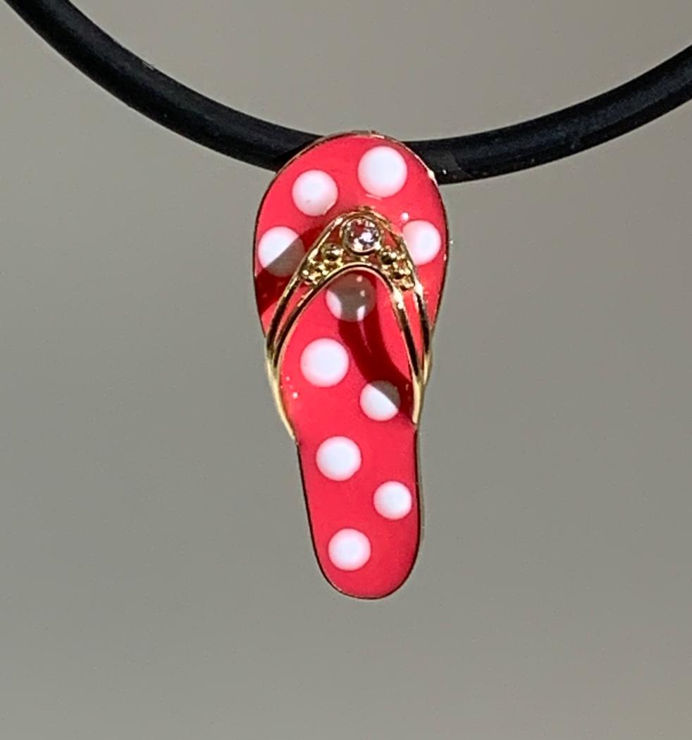 This sterling silver base with a 14k yellow gold frame around pink enamel with gold flecks disbursed throughout is the shape of a flip flop for any beach lover in your life! The flip flop tounge has 14k yellow gold bars in a double row width 14k yellow gold granulation beads down the center. The flip flop is 28.29mm long and 11.45mm wide. This is a small 14k yellow gold bail at the top that is free moving and will accommodates most standard size chains.